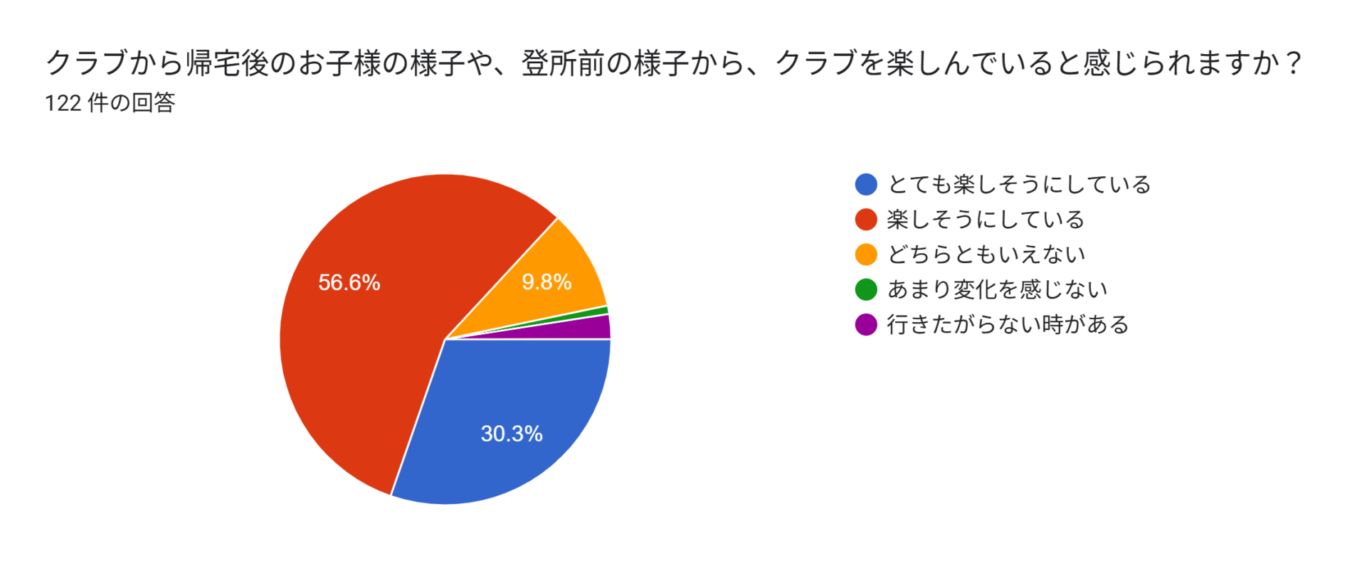 「とても楽しそう(30.3%)」「楽しそう(56.6%)」をあわせ、約87%のお子様がクラブでの時間を楽しんでくれている結果となりました。