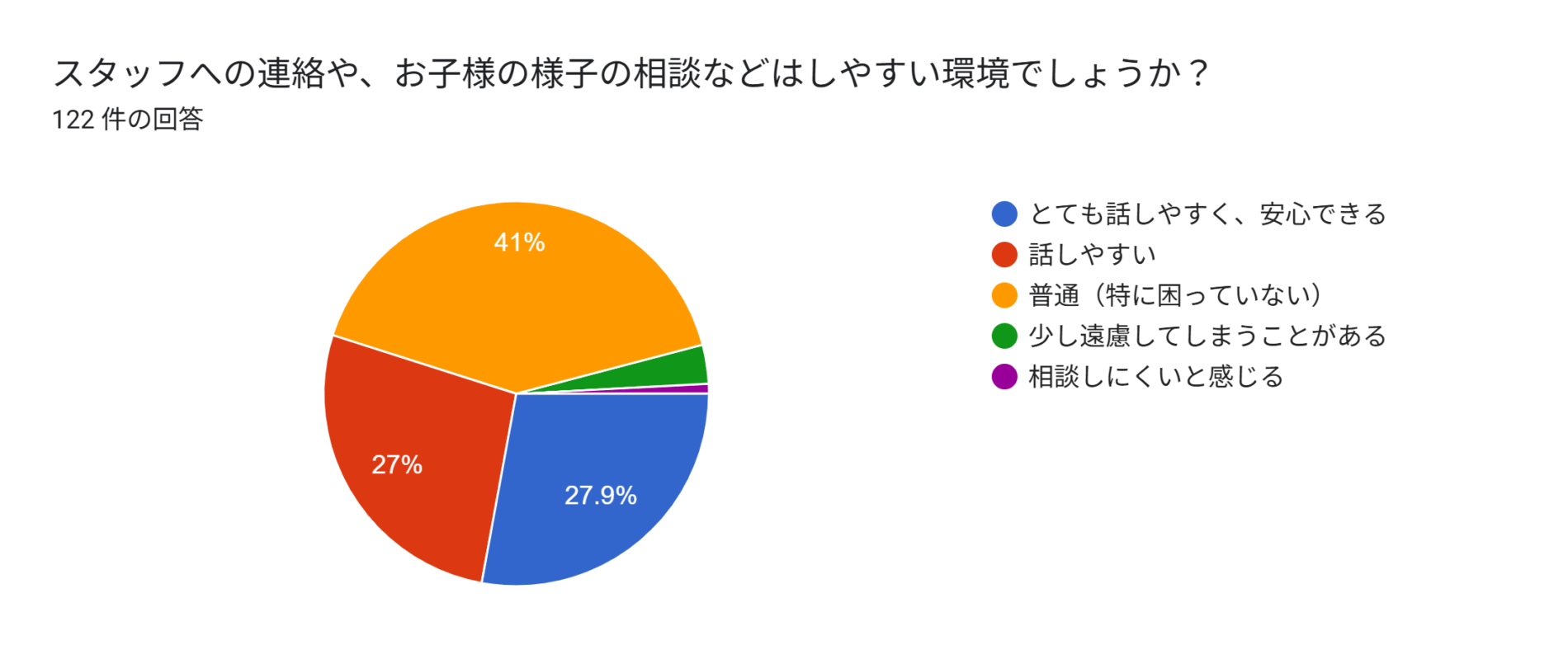 相談のしやすさについては、「話しやすい」「普通(困っていない)」等の回答が大半を占めました。また、スタッフの対応についても「十分に行き届いている」「概ね良い」との評価を多くいただいております。