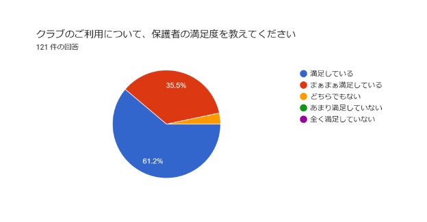 2024/12満足度保護者アンケート結果のお知らせ 2024年12月30日 最終更新日時 : 2025年6月28日 管理人 クラブご利用の保護者の皆様に行った無記名アンケートの結果についてご報告をさせていただきます。 12月2日より290世帯の保護者へのアンケート送付に対し121通のご回答を頂きました。 今回のアンケート結果と回答の詳細を今後のクラブ運営に活かし、保育の質の向上及び、保護者の利用満足度の向上に役立てて参ります。 お忙しい中、ご協力をいただきありがとうございました。※2024年12月30日現在の回答結果です。